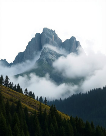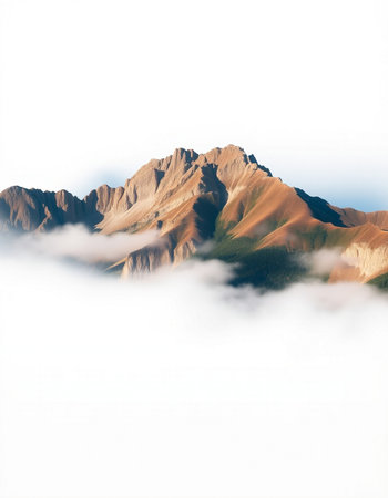 mountain peak in the clouds on a white background, nature series