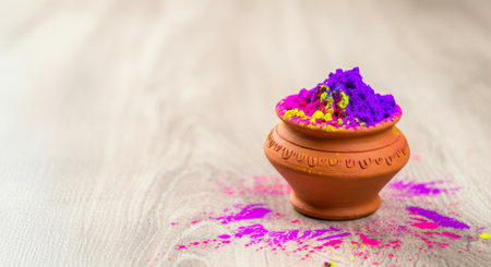 Clay pot with vibrant purple and yellow Holi powder on wooden surface.
