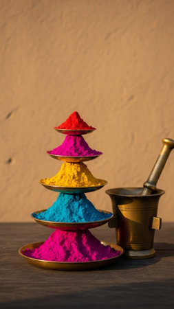 A vibrant and artistic arrangement featuring colorful spices, glowing candles, and fresh flowers symbolizes the essence of festive celebrations, creating an inviting atmosphere.
