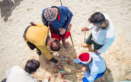 BIKANER, RAJASTHAN, INDIA - JANUARY 2019 : Group of Sikh male artist performing Punjabi Bhangra dance in colorful Yellow and Blue traditional dress on the streets on Bikaner city.