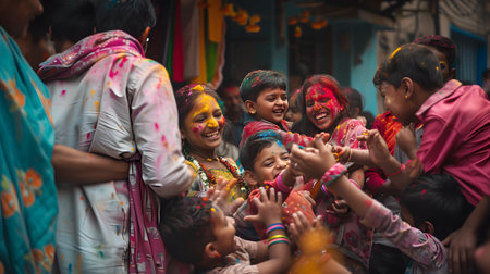 people celebrating holi at barsana on holi festival,with selective focus on subject and added noise and grains.