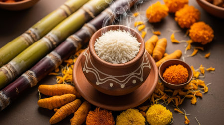 Hot rice in pot with sugarcane, carrots, marigolds on dark background