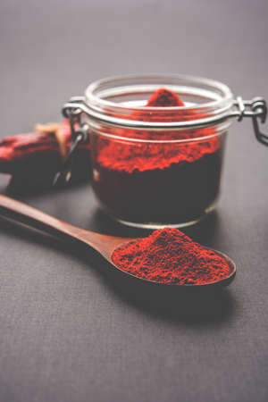 Red Chilly Powder in a bowl with dried red chillies over colourful background or pile of red chilli powder over plain background