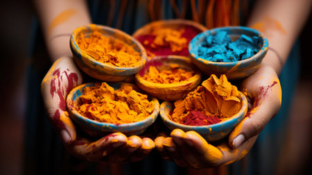 Indian festival Holi, showing close-up of colorful holi powder in bowls
