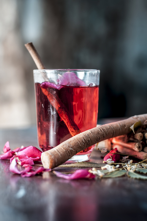 Indian Ayurvedic and Islamic way of doing brush with using miswak or Neem bark with rose water on wooden surface in dark Gothic colors.