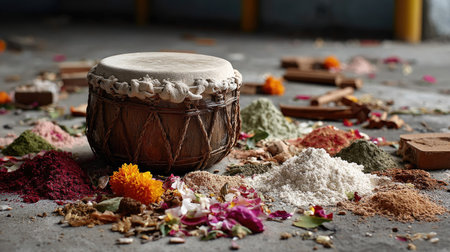 A traditional drum sits amidst a colorful arrangement of spices and flowers, capturing the essence of celebration and cultural heritage in a vibrant display.