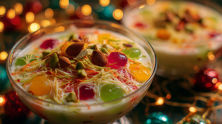 Mousse with nuts and candied fruits in a glass on Christmas background