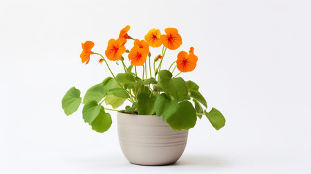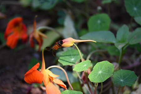 Bee on orange flowers of Tropaeolum majus plant (garden nasturtium, Indian cress, or monks cress) in a pot in natural light