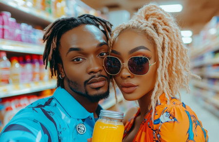 Stylish blonde woman and man in colorful outfits take a selfie while shopping in supermarket
