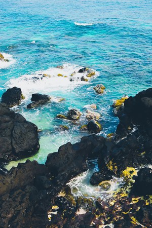 Aerial shot from drone. Top view on the rocky ocean shore. Blue Waves of the Pacific Ocean is crashing on the rock. White sea foam. Volcanic beach of Tropical Island Oahu Hawaii.