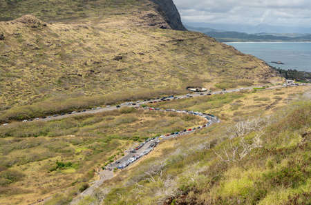 Congested parking at the trailhead to Makapuu point and the lighthouse on Oahu