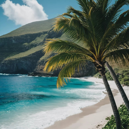 A breathtaking view of a rocky coastline featuring palm trees, turquoise waters, and waves gently crashing against the shore, embodying the tranquility of nature's beauty.