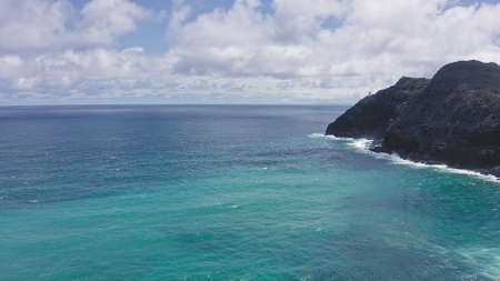 Flying drone over the ocean. View of makapuu lighthouse. Waves of Pacific Ocean wash Rocky shore. Magnificent mountains of Hawaiian island of Oahu against backdrop of blue sky with white clouds.