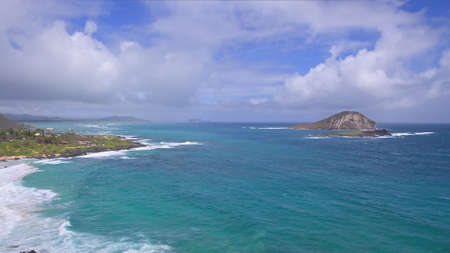 Sunrise over the island of Oahu. White clouds float across the blue sky. Blue Waves of the Pacific Ocean Beats Oahu Island Volcanic Cliffs. Turquoise water color. Clear sunny day. DCI 4k