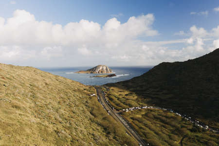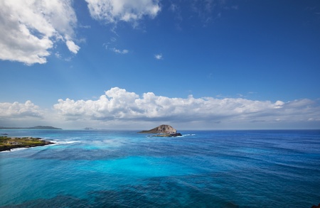 Blue, sunny seascape of seabird sanctuary and rabbit island at Makapuu Point, Oahu, Hawaii, USA.