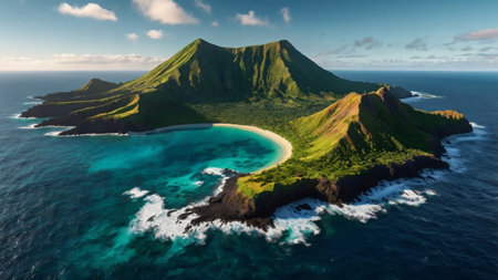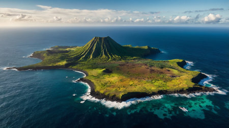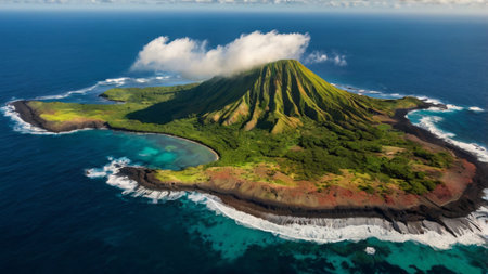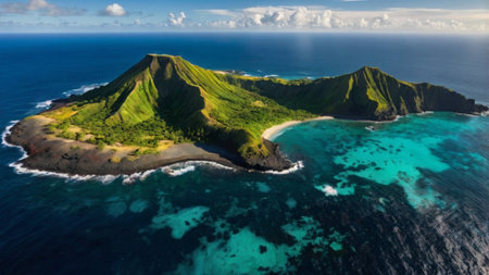 Aerial view of a tropical island with lush greenery and a mountain peak, surrounded by the vast blue ocean.