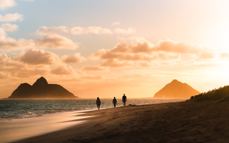 A silhouette photo of people and mountains in Lanikai Beach Oahu Hawaii at sunset