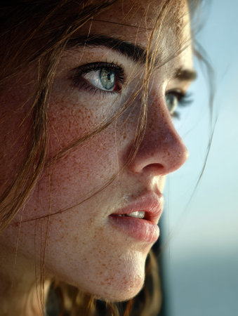A young woman with freckles and dark hair looks off into the distance, her face illuminated by sunlight.