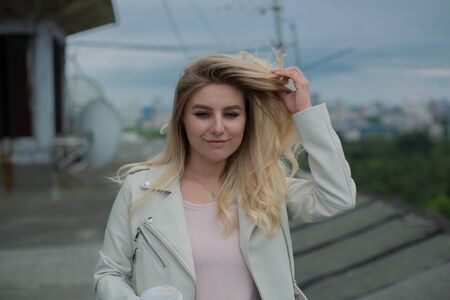 Fashion model blonde. Woman posing for photo session. A series of photos with a beautiful blonde outdoors in the city. ?ity walk in warm sunny autumn weather. Girl in a sweater. Girl at sunset. Sun