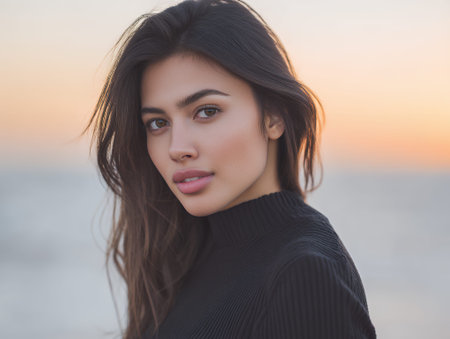 A young woman with dark hair and brown eyes looks directly at the camera with a soft expression. She is wearing a black turtleneck sweater. The background is a soft blur of pastel colors, suggesting an outdoor setting at sunset or sunrise.
