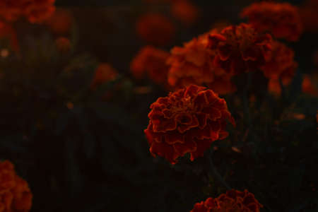 marigold flower in the garden in the sunset rays with a drop of dew, flower bed in a country house with a beautiful flower.