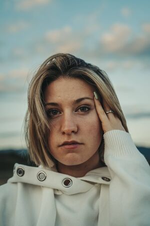 Portrait of a pretty girl with red hair against the blue sky.Woman portrait without retouching with her natural imperfections