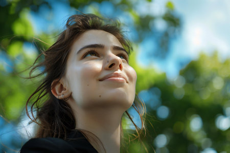 A close-up portrait of a young woman with a genuine smile, her face illuminated by natural sunlight that casts soft shadows. The image captures authentic beauty, happiness, and positive emotion.