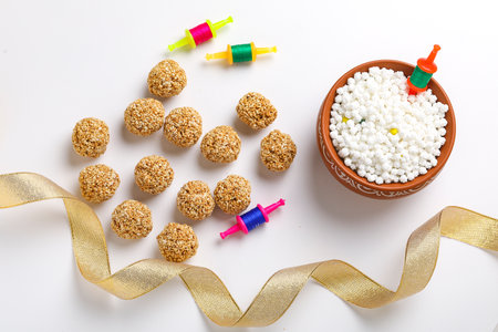 Indian festival makar sankranti concept : tilgul and sesame seed ball or laddo on white background