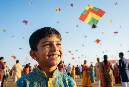 Indian boy smiling and looking upwards at colorful kites flying in the air, capturing a joyful moment of childhood during an outdoor celebration or festival