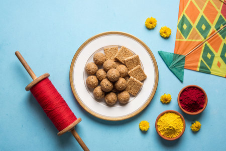 Top view of a white plate filled with til ladoo and sesame chikki next to a colorful kite and wooden spool of red string surrounded by marigold flowers and turmeric powder on a blue surface.