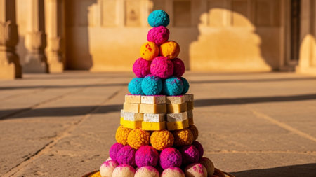 An exquisite display of Indian festive traditions unfolds with illuminated diyas casting a warm glow. Richly textured fabrics, ornate vessels, and colorful offerings create a sensory experience. This image captures the essence of cultural celebrations, spiritual rituals, and the joy of communal gatherings, perfect for conveying heritage and festivity.