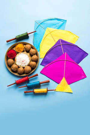 indian makar sankranti festival greeting with kites and spool of strings