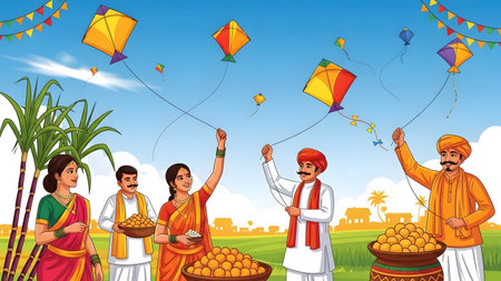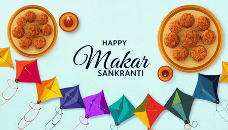 Colorful illustration celebrating Makar Sankranti with traditional sweets and kites