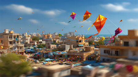 A vibrant urban scene showcasing colorful kites flying high in the sunny sky, capturing the joyful spirit of a festive celebration in the city.