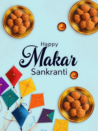 Celebratory graphic for Makar Sankranti featuring sweets and kites