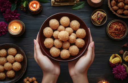 Top view of Gulab Laddu with other sweets on a Diwali festival-decorated table