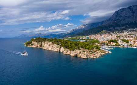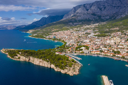 Aerial drone view .Beautiful coastline from a bird's eye view near the city of Makarska, Dalmatia, Croatia. Makarska Riviera, famous and tourist place in Europe