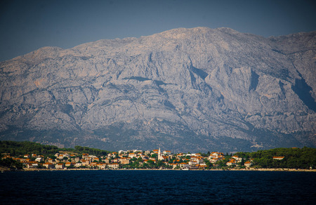 Sea View of small town Sumartin of Brac island in front of Biokovo mountain range, Adriatic sea, Croatia