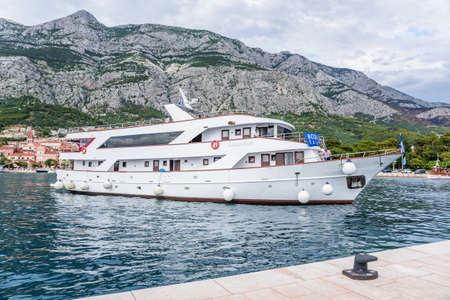 Pleasure boat with cheerful tourists enters the port of Makarska, Croatia.