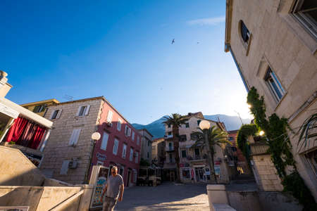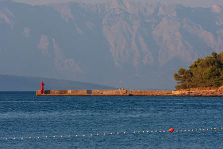 Shore of the Adriatic Sea. Sea coast of Croatia. Calm water. Beautiful places of the sea European cities. Sky with clouds and mountains.