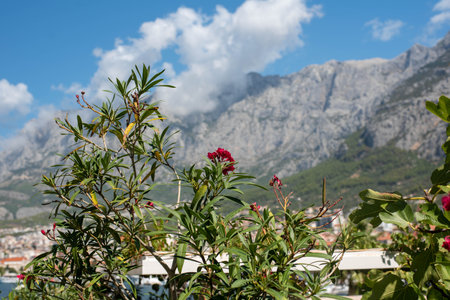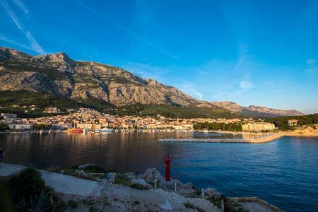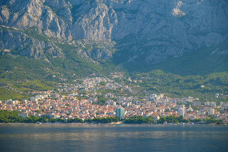 Landscape of Makarska town in the Adriatic sea coast under the Biokovo mountain in Croatia, during summer sunny day