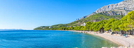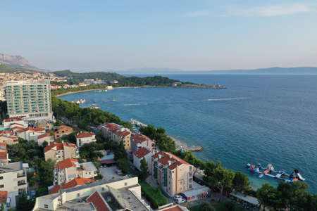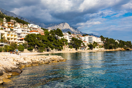 beautiful view of the coastline in Baska Voda resort with big mountains in the background, Croatia