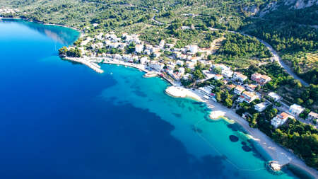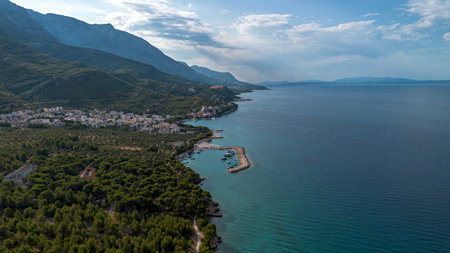 Aerial drone view. Beautiful coastline, clear sea from a bird's eye view of Dalmatia, Croatia. Makarska Riviera, famous and tourist place in Europe, Makarska