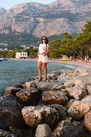 Attractive young woman stand on rocks by the sea. Stylish female in front of big mountains