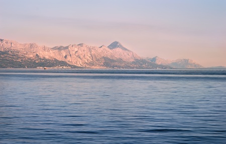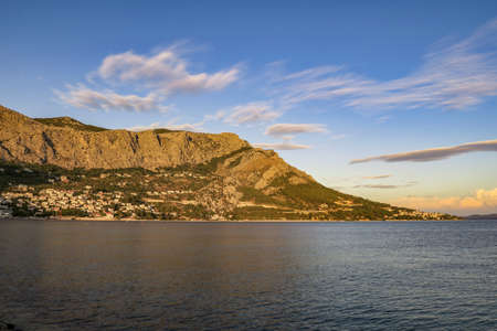 Landscape of Adriatic sea and croatian coast near tourist resort Baska voda at down in summer