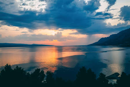 Colorful sunset on Makarska Riviera, popular touristic coastline of the Adriatic Sea in Split-Dalmatia County of the Republic of Croatia