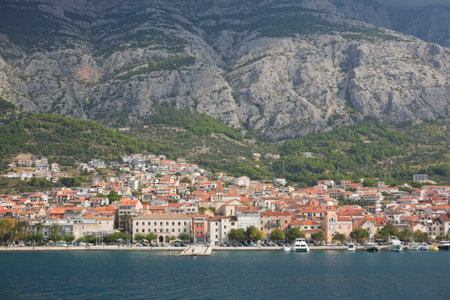 Cityscape of Makarska, Croatia. View of the city from the sea.