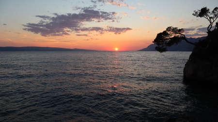 Sunset at the sea, silhouette of a pine tree on a rock against the background of the evening sky and the sun on the horizon, Croatia, Brela