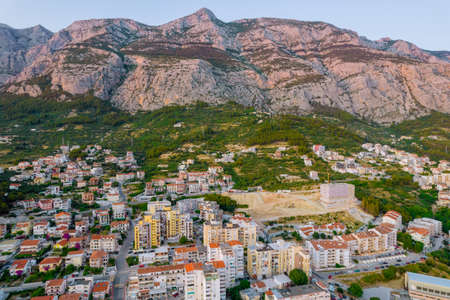 Drone aerial view of Makarska city, Croatia. Sunset over the city, beach and se. Biokovo mountains in the background. Summer time.
