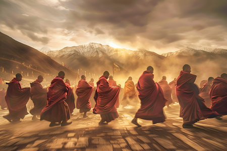 Group of monks walking on rocky path in rural landscape at sunset